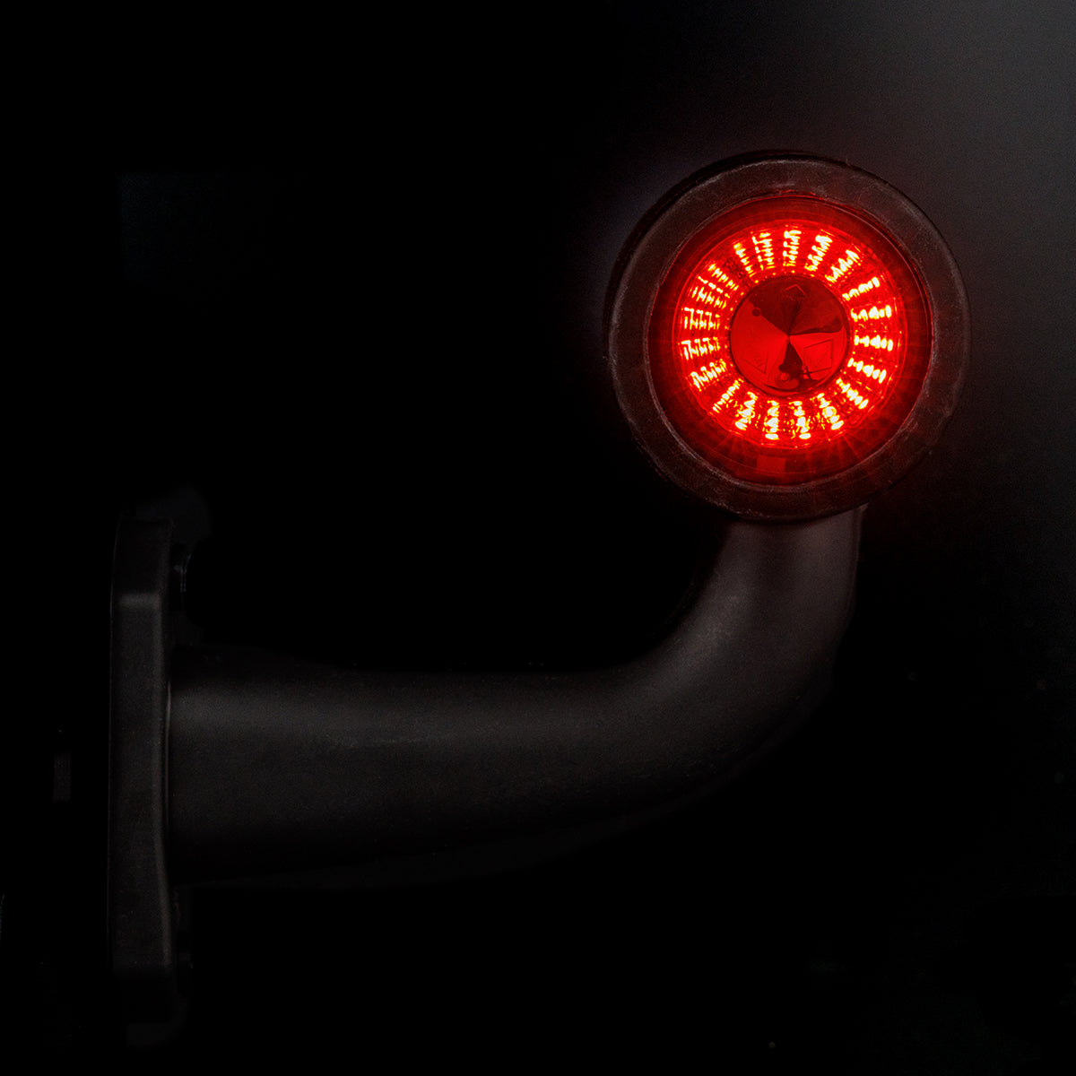 Lampa obrysowa prawa, biało-czerwona, zaprojektowana dla użytkowników, którzy potrzebują wydajnego, trwałego i dobrze widocznego oświetlenia bocznego. Dzięki zakresowi zasilania 12-24 V pasuje do różnych systemów elektrycznych. Krótka łamana konstrukcja pozwala na montaż w miejscach o ograniczonej przestrzeni – idealnie nadaje się tam, gdzie pełna prosta lampa by się nie dopasowała lub kolidowała. Kolor biały + czerwony spełnia normy oświetlenia obrysowego – zwiększa widoczność pojazdu od boku i poprawia bezpieczeństwo.