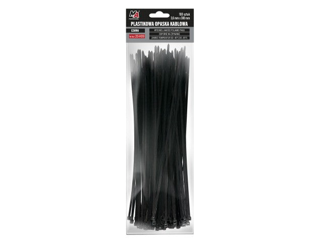 Zestaw 100 czarnych opasek kablowych (taśm zaciskowych) o wymiarach 300 mm długości i 3,6 mm szerokości — idealny do uporządkowania przewodów w instalacjach elektrycznych, pojazdach, szafach sterowniczych czy w warsztacie.