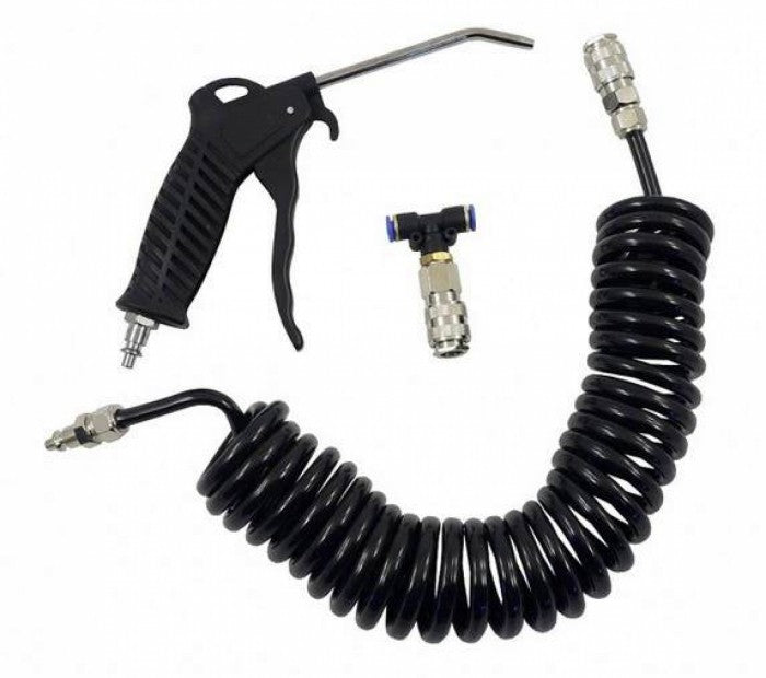 Zestaw zawierający wąż pneumatyczny o średnicy 8 mm wraz z pistoletem do przedmuchiwania. To solidne i praktyczne rozwiązanie do codziennych zastosowań w warsztatach, serwisach czy rolach mobilnych – idealne do oczyszczania, suszenia i innych prac z użyciem sprężonego powietrza.